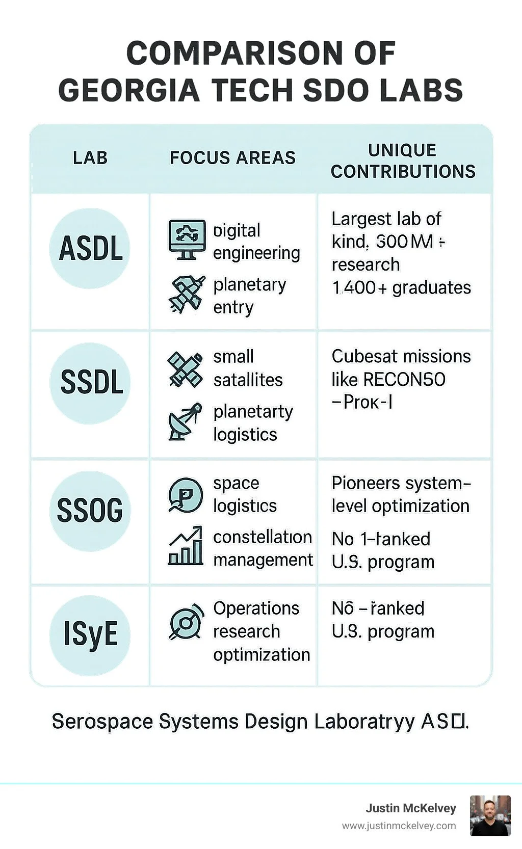 Lab / Group Key Focus Areas & Contributions ASDL Aerospace Systems Design Laboratory: Largest lab of its kind, $300M+ research, 1,400+ graduates, digital engineering, complex vehicle design. SSDL Space Systems Design Laboratory: Small satellites, cubesat missions (e.g., RECONSO, Prox-1), planetary entry, mission control. SSOG Space Systems Optimization Group: Pioneers system-level optimization for space logistics, campaign scheduling, constellation management. ISyE Industrial & Systems Engineering: No. 1–ranked U.S. program, global leader in operations research and optimization. AE-SDO Group Unifies aeronautical and space vehicle design, uses advanced visualization (CoVE, CoDE), supports research for NASA, FAA, AFRL, ONR.